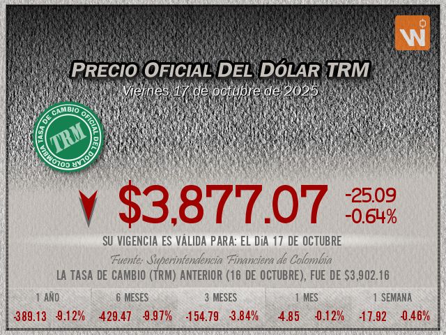 Esta es la TRM vigente del viernes 17 de octubre de 2025. Un (1) dólar estadounidense equivale a $3,877.07 (tres mil ochocientos setenta y siete pesos con siete centavos colombianos).
