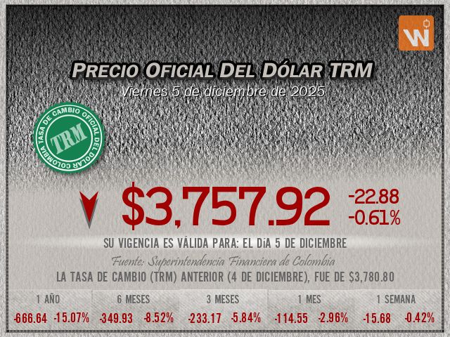 La tasa TRM a la que se liquida el precio del dólar es de $3,757.92, con vigencia para el viernes 5 de diciembre de 2025.