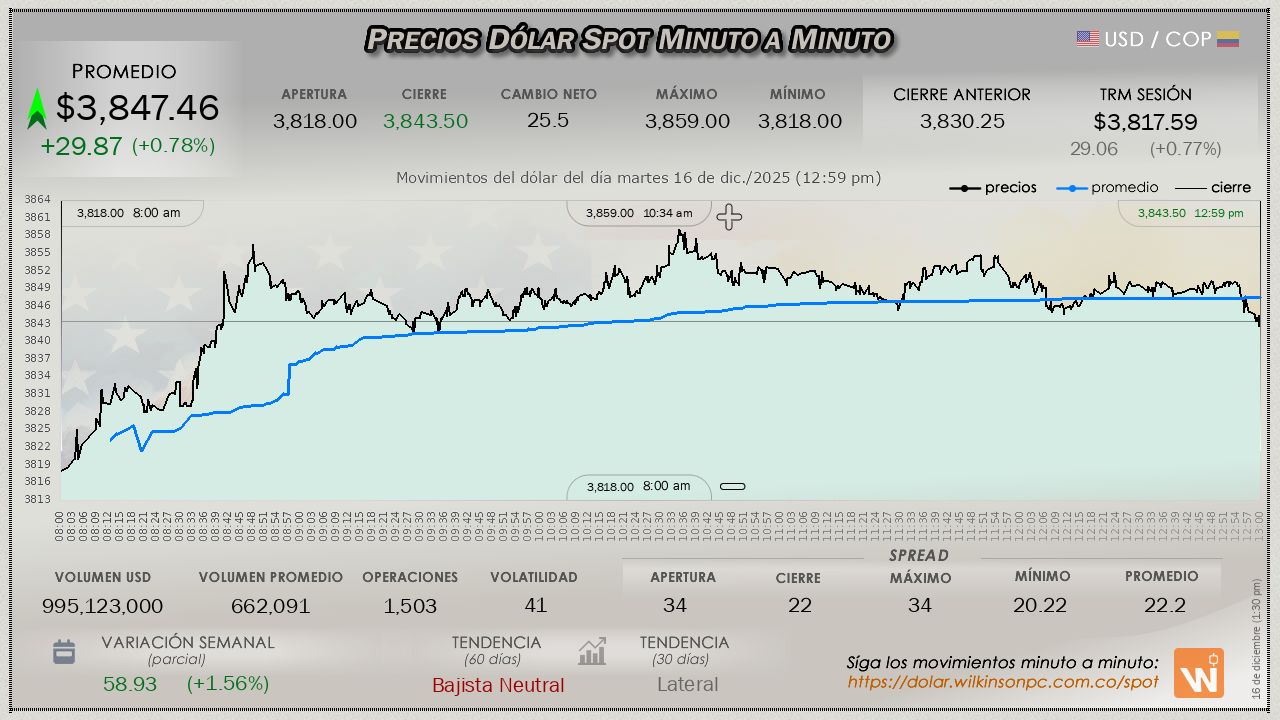 El mercado del dólar SPOT, en la jornada del martes (hoy inicia la Novena de Aguinaldos), tiene un incremento consistente desde el comienzo de la jornada, con un valor promedio de $3,844.91, un margen por encima de la TRM, aventajándola en $27.32 pesos (potenciando las ganancias de la jornada previa), la TRM en cuestión establecida en $3,817.59 para la sesión.