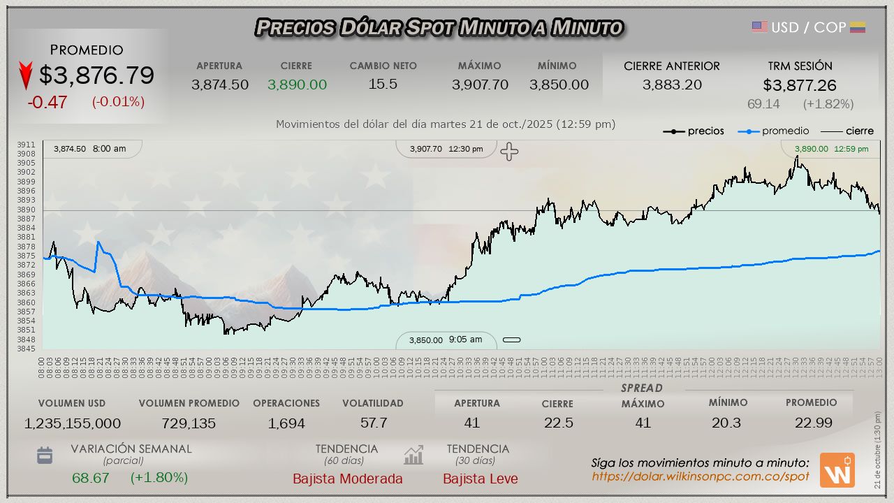 En el mercado SPOT, el dólar finalizó la jornada del martes, evidenciando una recuperación sólo respecto a la apertura de la sesión, con un precio promedio de $3,876.79, con apenas una variación de tan solo $-0.47 pesos por debajo de la Tasa Representativa del Mercado (TRM), fijada en $3,877.26 para la sesión.