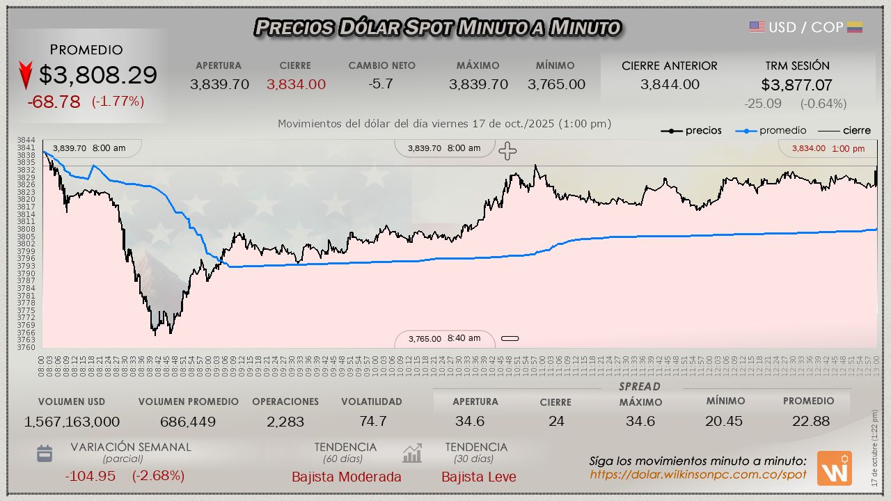 En el mercado SPOT, el dólar finalizó la jornada del viernes, evidenciando un descenso continuado desde que inició la jornada, con un precio promedio de $3,808.29, alejándose significativamente de la Tasa Representativa del Mercado (TRM), perdiendo $-68.78 pesos, la TRM referida fijada en $3,877.07 para el día.