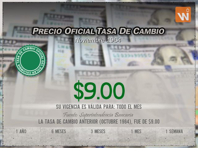 La tasa TRM a la que se liquida el precio del dólar es de $9.00, con vigencia para el domingo 1 de noviembre de 1964.