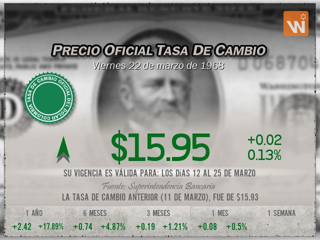 La tasa TRM a la que se liquida el precio del dólar es de $15.95, con vigencia para el viernes 22 de marzo de 1968.