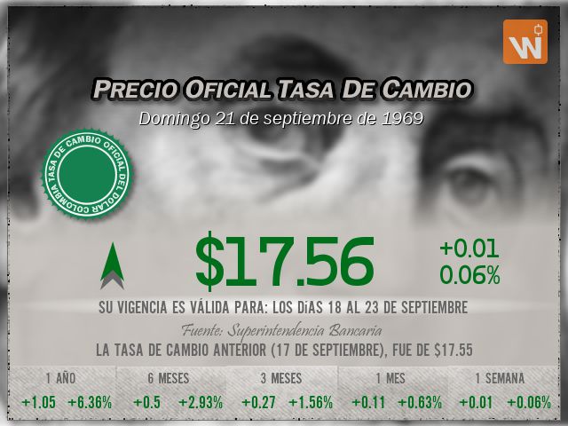 La tasa TRM a la que se liquida el precio del dólar es de $17.56, con vigencia para el domingo 21 de septiembre de 1969.