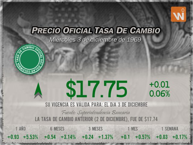 La tasa TRM a la que se liquida el precio del dólar es de $17.75, con vigencia para el miércoles 3 de diciembre de 1969.