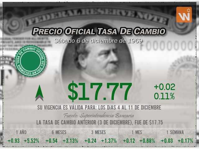 La tasa de cambio representativa del mercado (Tasa de Cambio) se fijó en $17.77 para el día sábado 6 de diciembre de 1969, lo que representa un aumento de $0.02 (una variación del 0.11%) frente a la Tasa de Cambio anterior de $17.75. Una pequeñísima diferencia de tan solo 0.02 pesos.