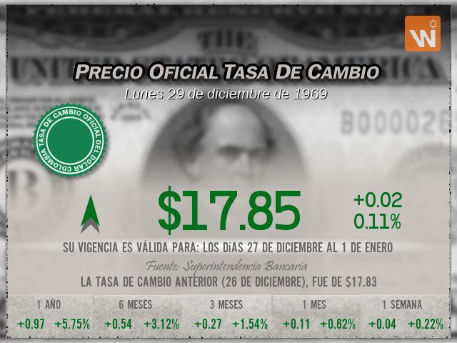 Esta es la Tasa de Cambio del lunes 29 de diciembre de 1969, y su vigencia cubre los días 27 de diciembre al 1 de enero. Un (1) dólar estadounidense equivale a 'diecisiete pesos con ochenta y cinco centavos colombianos'.