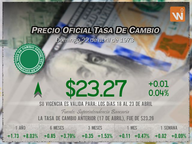 La tasa TRM a la que se liquida el precio del dólar es de $23.27, con vigencia para el domingo 22 de abril de 1973.