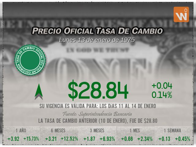 La tasa TRM a la que se liquida el precio del dólar es de $28.84, con vigencia para el lunes 13 de enero de 1975.
