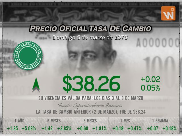 La tasa TRM a la que se liquida el precio del dólar es de $38.26, con vigencia para el domingo 5 de marzo de 1978.