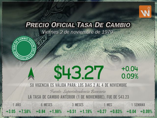 La tasa TRM a la que se liquida el precio del dólar es de $43.27, con vigencia para el viernes 2 de noviembre de 1979.