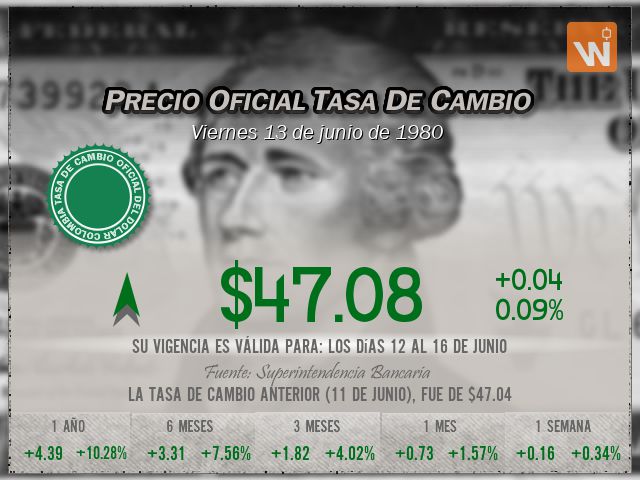 La tasa de cambio representativa del mercado (Tasa de Cambio) se fijó en $47.08 para el día viernes 13 de junio de 1980, lo que representa un aumento de $0.04 (una variación del 0.09%) frente a la Tasa de Cambio anterior de $47.04. Una pequeñísima diferencia de tan solo 0.04 pesos.