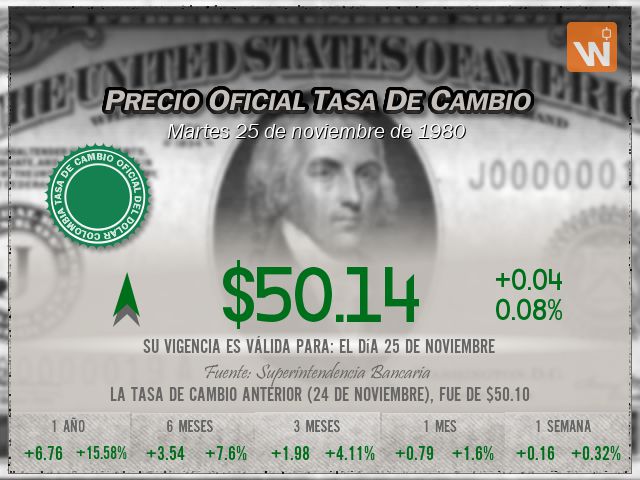 La tasa TRM a la que se liquida el precio del dólar es de $50.14, con vigencia para el martes 25 de noviembre de 1980.