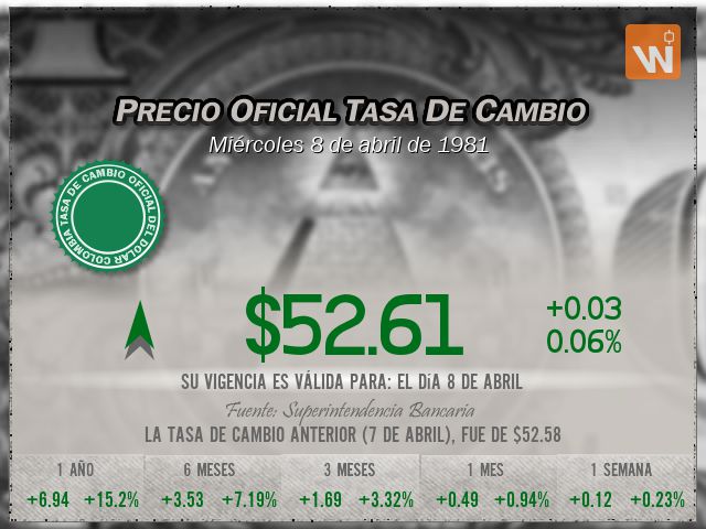 La tasa de cambio representativa del mercado (Tasa de Cambio) se fijó en $52.61 para el día miércoles 8 de abril de 1981, lo que representa un aumento de $0.03 (una variación del 0.06%) frente a la Tasa de Cambio anterior de $52.58. Una pequeñísima diferencia de tan solo 0.03 pesos.