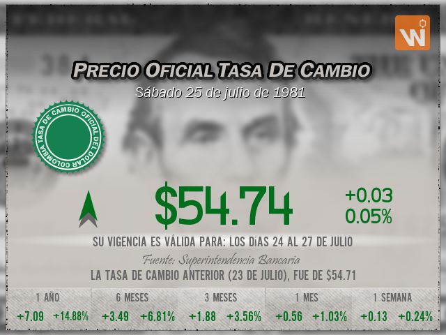 La tasa TRM a la que se liquida el precio del dólar es de $54.74, con vigencia para el sábado 25 de julio de 1981.