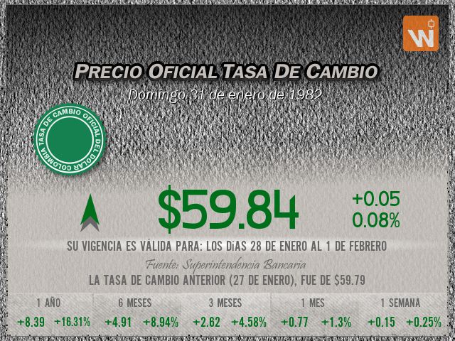 La tasa TRM a la que se liquida el precio del dólar es de $59.84, con vigencia para el domingo 31 de enero de 1982.
