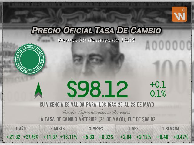 La tasa de cambio representativa del mercado (Tasa de Cambio) se fijó en $98.12 para el día viernes 25 de mayo de 1984, lo que representa un aumento de $0.10 (una variación del 0.10%) frente a la Tasa de Cambio anterior de $98.02. Una pequeñísima diferencia de tan solo 0.10 pesos.
