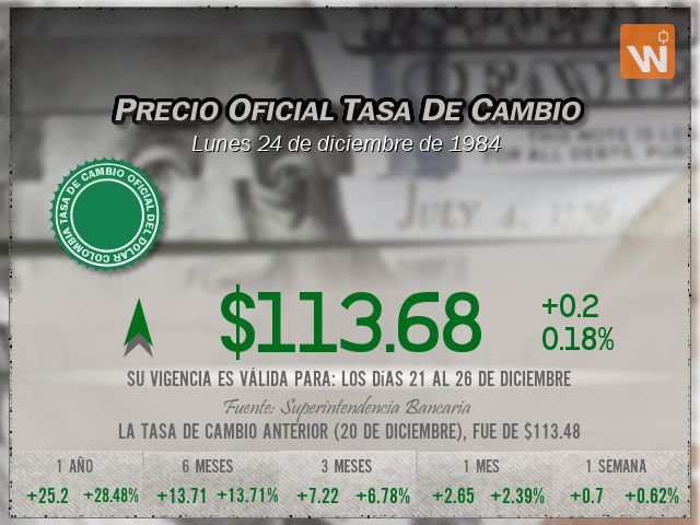 La tasa TRM a la que se liquida el precio del dólar es de $113.68, con vigencia para el lunes 24 de diciembre de 1984.