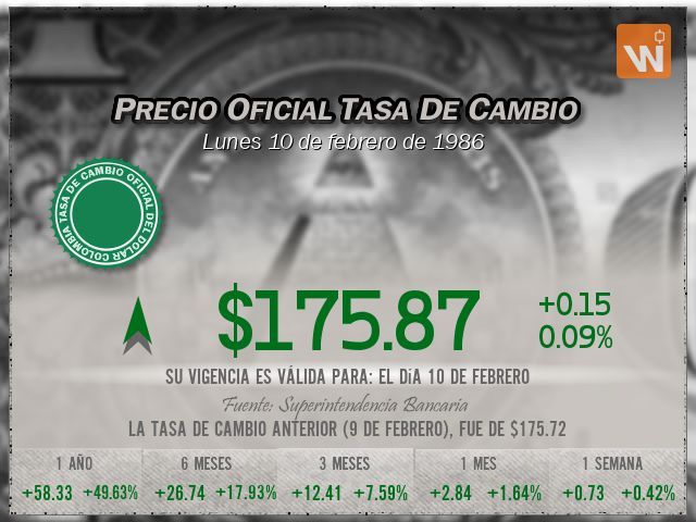 La tasa de cambio representativa del mercado (Tasa de Cambio) se fijó en $175.87 para el día lunes 10 de febrero de 1986, lo que representa un aumento de $0.15 (una variación del 0.09%) frente a la Tasa de Cambio anterior de $175.72. Una pequeñísima diferencia de tan solo 0.15 pesos.