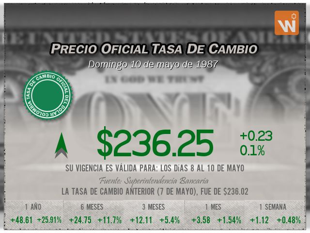 La tasa TRM a la que se liquida el precio del dólar es de $236.25, con vigencia para el domingo 10 de mayo de 1987.