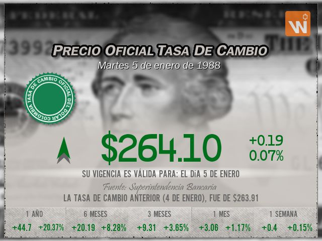 La tasa de cambio representativa del mercado (Tasa de Cambio) se fijó en $264.10 para el día martes 5 de enero de 1988, lo que representa un aumento de $0.19 (una variación del 0.07%) frente a la Tasa de Cambio anterior de $263.91. Una pequeñísima diferencia de tan solo 0.19 pesos.