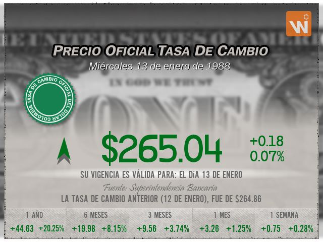 La tasa TRM a la que se liquida el precio del dólar es de $265.04, con vigencia para el miércoles 13 de enero de 1988.