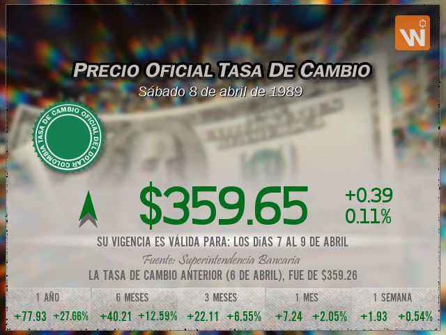 La tasa TRM a la que se liquida el precio del dólar es de $359.65, con vigencia para el sábado 8 de abril de 1989.