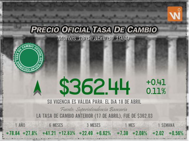 La tasa TRM a la que se liquida el precio del dólar es de $362.44, con vigencia para el martes 18 de abril de 1989.