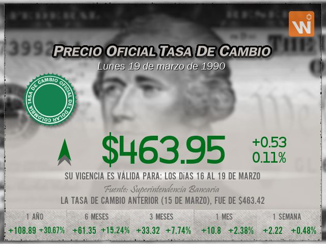 La tasa de cambio representativa del mercado (Tasa de Cambio) se fijó en $463.95 para el día lunes 19 de marzo de 1990, lo que representa un aumento de $0.53 (una variación del 0.11%) frente a la Tasa de Cambio anterior de $463.42. Una pequeñísima diferencia de tan solo 0.53 pesos.