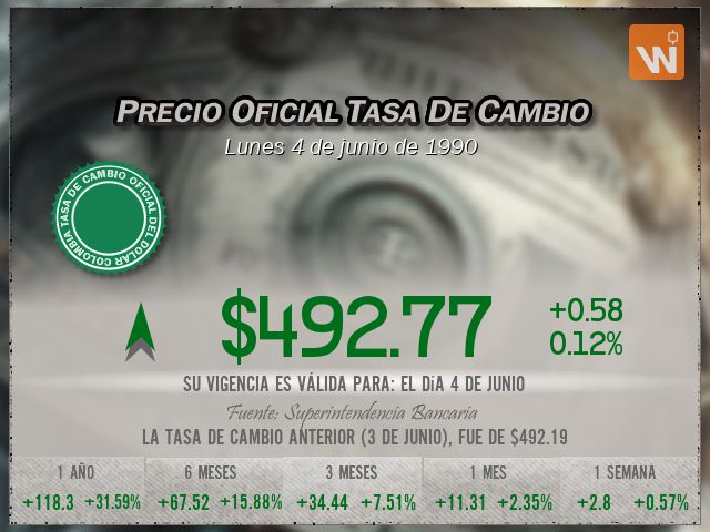 La tasa de cambio representativa del mercado (Tasa de Cambio) se fijó en $492.77 para el día lunes 4 de junio de 1990, lo que representa un aumento de $0.58 (una variación del 0.12%) frente a la Tasa de Cambio anterior de $492.19. Una pequeñísima diferencia de tan solo 0.58 pesos.