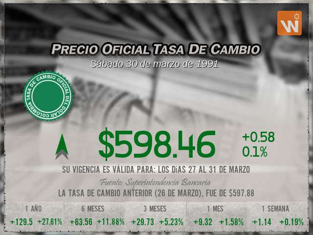 La tasa de cambio representativa del mercado (Tasa de Cambio) se fijó en $598.46 para el día sábado 30 de marzo de 1991, lo que representa un aumento de $0.58 (una variación del 0.10%) frente a la Tasa de Cambio anterior de $597.88. Una pequeñísima diferencia de tan solo 0.58 pesos.