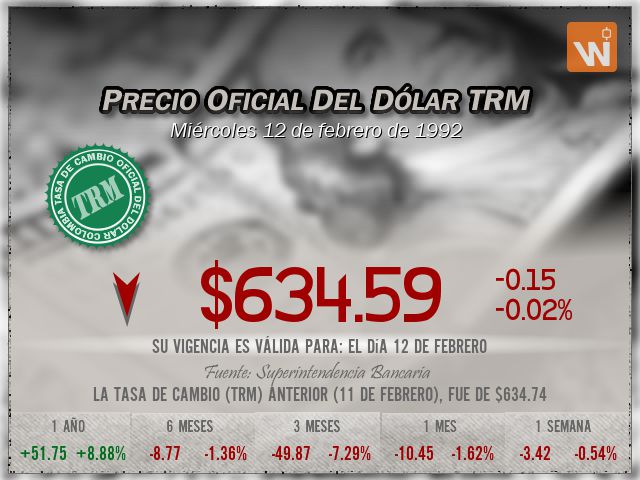 La tasa TRM a la que se liquida el precio del dólar es de $634.59, con vigencia para el miércoles 12 de febrero de 1992.