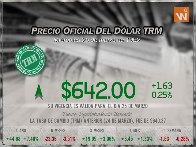 La tasa de cambio representativa del mercado (TRM) se fijó en $642.00 para el día miércoles 25 de marzo de 1992, lo que representa un aumento de $1.63 (una variación del 0.25%) frente a la TRM anterior de $640.37. Una pequeñísima diferencia de tan solo 1.63 pesos.