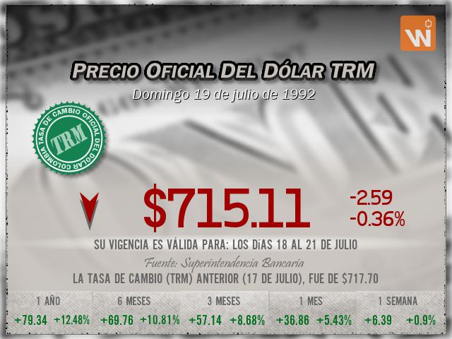 La tasa de cambio representativa del mercado (TRM) se fijó en $715.11 para el día domingo 19 de julio de 1992, lo que representa una disminución de $-2.59 (una variación del -0.36%) frente a la TRM anterior de $717.70. Una pequeñísima diferencia de tan solo -2.59 pesos.