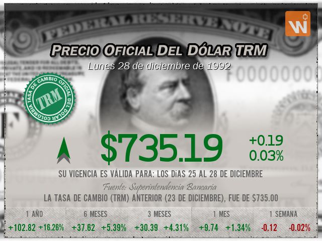 La tasa de cambio representativa del mercado (TRM) se fijó en $735.19 para el día lunes 28 de diciembre de 1992, lo que representa un aumento de $0.19 (una variación del 0.03%) frente a la TRM anterior de $735.00. Una pequeñísima diferencia de tan solo 0.19 pesos.