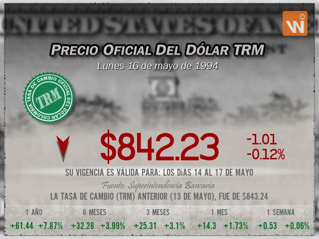 La tasa de cambio representativa del mercado (TRM) se fijó en $842.23 para el día lunes 16 de mayo de 1994, lo que representa una disminución de $-1.01 (una variación del -0.12%) frente a la TRM anterior de $843.24. Una pequeñísima diferencia de tan solo -1.01 pesos.