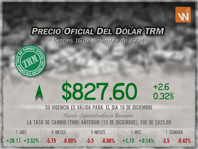 La tasa de cambio representativa del mercado (TRM) se fijó en $827.60 para el día viernes 16 de diciembre de 1994, lo que representa un aumento de $2.60 (una variación del 0.32%) frente a la TRM anterior de $825.00. Una pequeñísima diferencia de tan solo 2.60 pesos.
