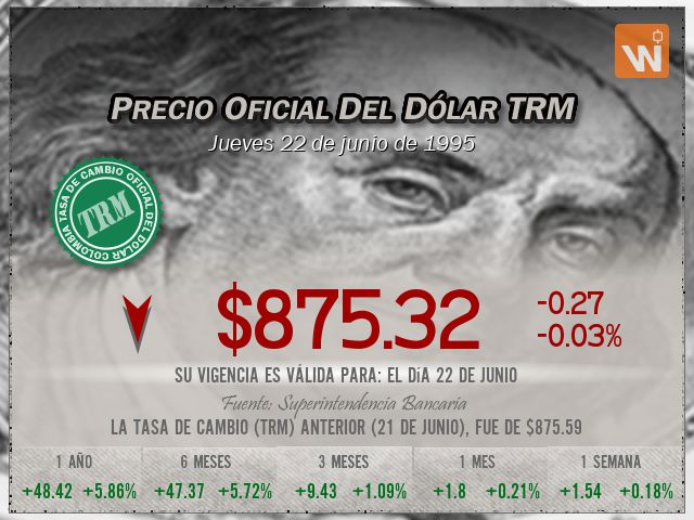La tasa de cambio representativa del mercado (TRM) se fijó en $875.32 para el día jueves 22 de junio de 1995, lo que representa una disminución de $-0.27 (una variación del -0.03%) frente a la TRM anterior de $875.59. Una pequeñísima diferencia de tan solo -0.27 pesos.