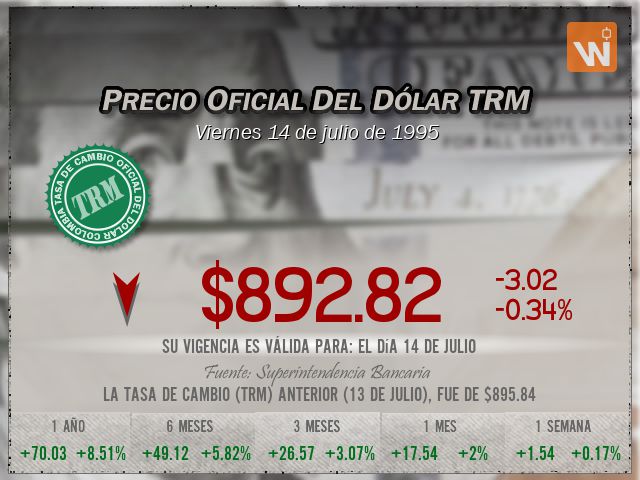 La tasa de cambio representativa del mercado (TRM) se fijó en $892.82 para el día viernes 14 de julio de 1995, lo que representa una disminución de $-3.02 (una variación del -0.34%) frente a la TRM anterior de $895.84. Una pequeñísima diferencia de tan solo -3.02 pesos.