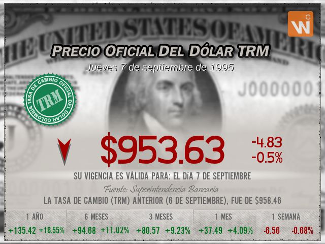 La tasa de cambio representativa del mercado (TRM) se fijó en $953.63 para el día jueves 7 de septiembre de 1995, lo que representa una disminución de $-4.83 (una variación del -0.50%) frente a la TRM anterior de $958.46. Una pequeñísima diferencia de tan solo -4.83 pesos.