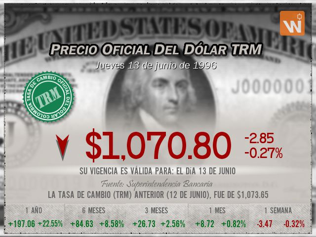 La tasa de cambio representativa del mercado (TRM) se fijó en $1,070.80 para el día jueves 13 de junio de 1996, lo que representa una disminución de $-2.85 (una variación del -0.27%) frente a la TRM anterior de $1,073.65. Una pequeñísima diferencia de tan solo -2.85 pesos.