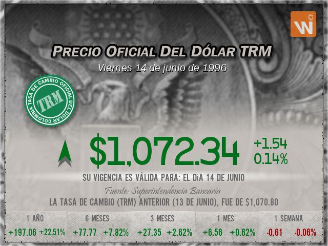 La tasa de cambio representativa del mercado (TRM) se fijó en $1,072.34 para el día viernes 14 de junio de 1996, lo que representa un aumento de $1.54 (una variación del 0.14%) frente a la TRM anterior de $1,070.80. Una pequeñísima diferencia de tan solo 1.54 pesos.