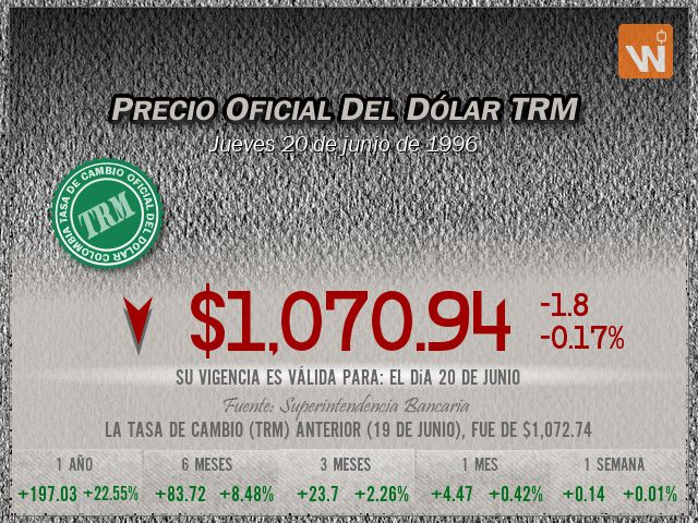 La tasa de cambio representativa del mercado (TRM) se fijó en $1,070.94 para el día jueves 20 de junio de 1996, lo que representa una disminución de $-1.80 (una variación del -0.17%) frente a la TRM anterior de $1,072.74. Una pequeñísima diferencia de tan solo -1.80 pesos.