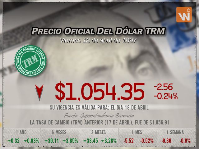 La tasa de cambio representativa del mercado (TRM) se fijó en $1,054.35 para el día viernes 18 de abril de 1997, lo que representa una disminución de $-2.56 (una variación del -0.24%) frente a la TRM anterior de $1,056.91. Una pequeñísima diferencia de tan solo -2.56 pesos.
