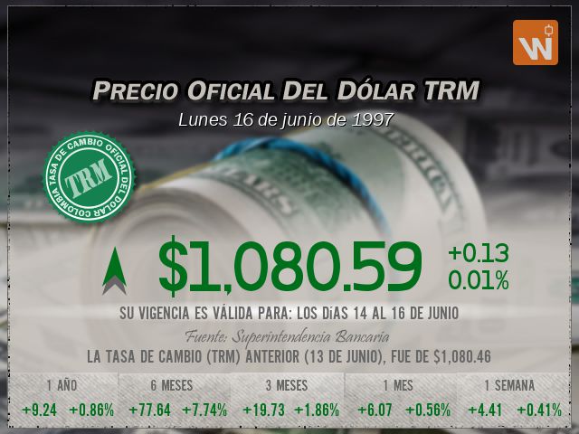 La tasa de cambio representativa del mercado (TRM) se fijó en $1,080.59 para el día lunes 16 de junio de 1997, lo que representa un aumento de $0.13 (una variación del 0.01%) frente a la TRM anterior de $1,080.46. Una pequeñísima diferencia de tan solo 0.13 pesos.