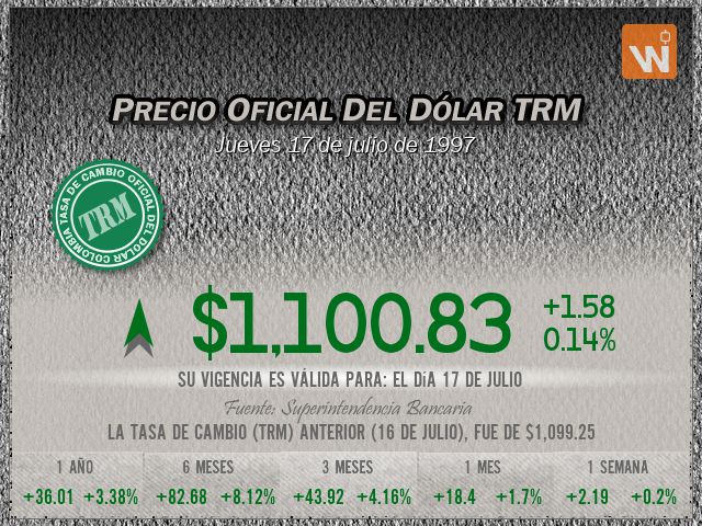 La tasa de cambio representativa del mercado (TRM) se fijó en $1,100.83 para el día jueves 17 de julio de 1997, lo que representa un aumento de $1.58 (una variación del 0.14%) frente a la TRM anterior de $1,099.25. Una pequeñísima diferencia de tan solo 1.58 pesos.