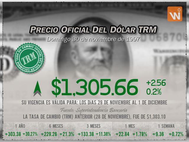 La tasa de cambio representativa del mercado (TRM) se fijó en $1,305.66 para el día domingo 30 de noviembre de 1997, lo que representa un aumento de $2.56 (una variación del 0.20%) frente a la TRM anterior de $1,303.10. Una pequeñísima diferencia de tan solo 2.56 pesos.