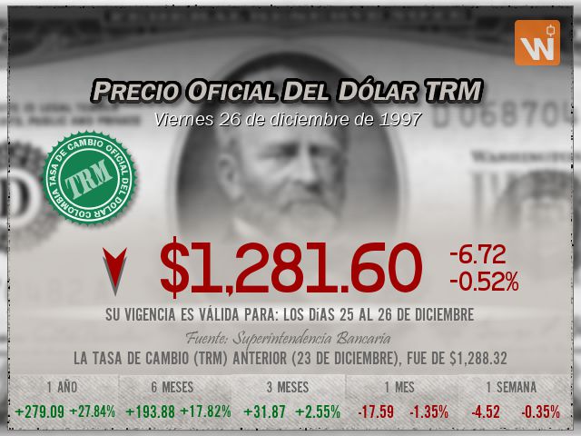 La tasa de cambio representativa del mercado (TRM) se fijó en $1,281.60 para el día viernes 26 de diciembre de 1997, lo que representa una disminución de $-6.72 (una variación del -0.52%) frente a la TRM anterior de $1,288.32. Una muy corta diferencia de tan solo -6.72 pesos.