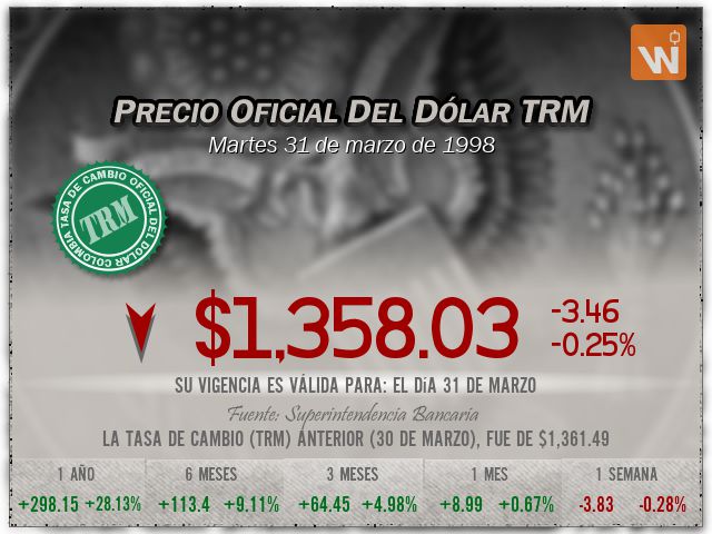 La tasa de cambio representativa del mercado (TRM) se fijó en $1,358.03 para el día martes 31 de marzo de 1998, lo que representa una disminución de $-3.46 (una variación del -0.25%) frente a la TRM anterior de $1,361.49. Una pequeñísima diferencia de tan solo -3.46 pesos.