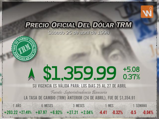 La tasa de cambio representativa del mercado (TRM) se fijó en $1,359.99 para el día sábado 25 de abril de 1998, lo que representa un aumento de $5.08 (una variación del 0.37%) frente a la TRM anterior de $1,354.91. Una muy corta diferencia de tan solo 5.08 pesos.
